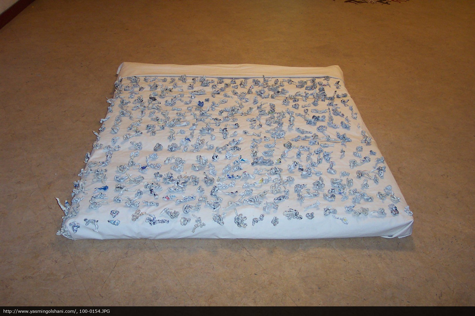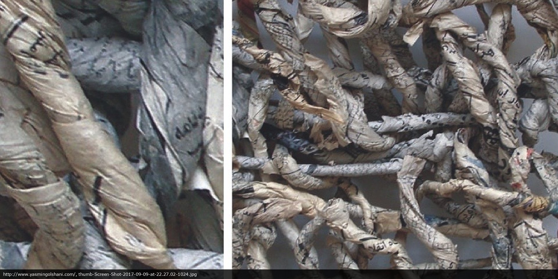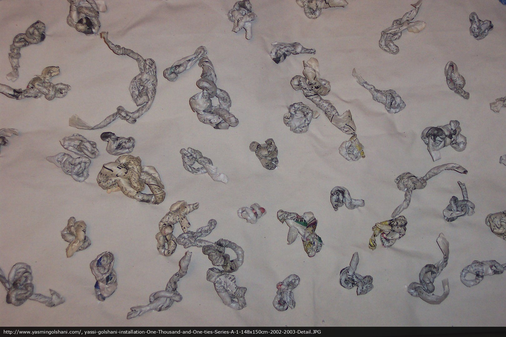 2002 - 2003. (150 x 148 cm). One Thousand and One Ties. Installation made of Iranian, French, and English newspapers sewed to a piece of cloth. The work symbolizes the complicated political issues of the Middle East. It also is a reference to an old Iranian tradition of making a tie in a sacred place when one has a wish.