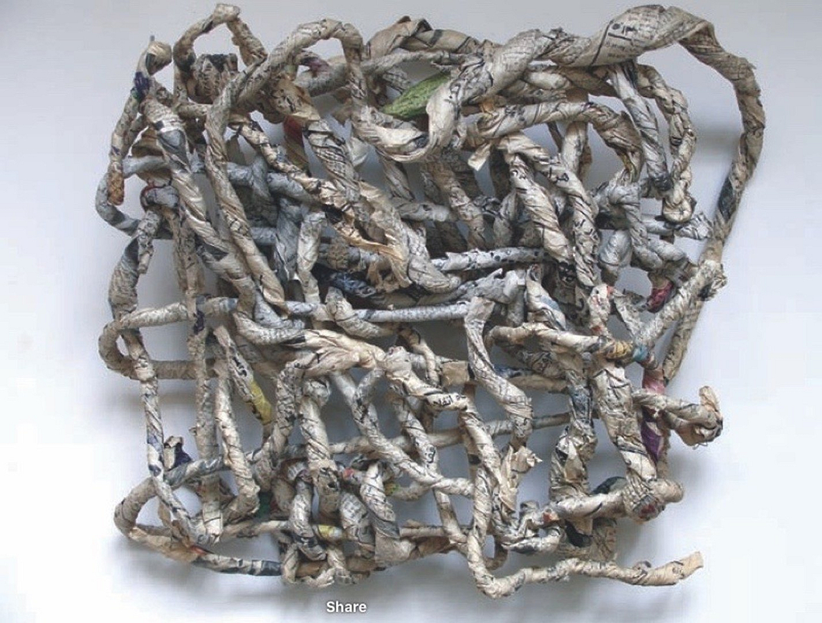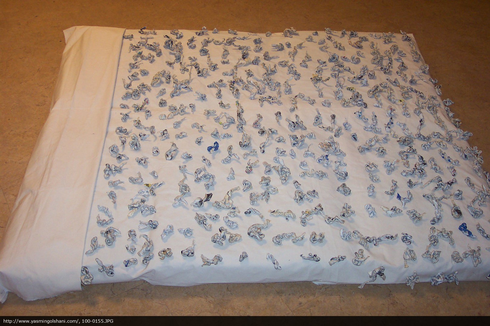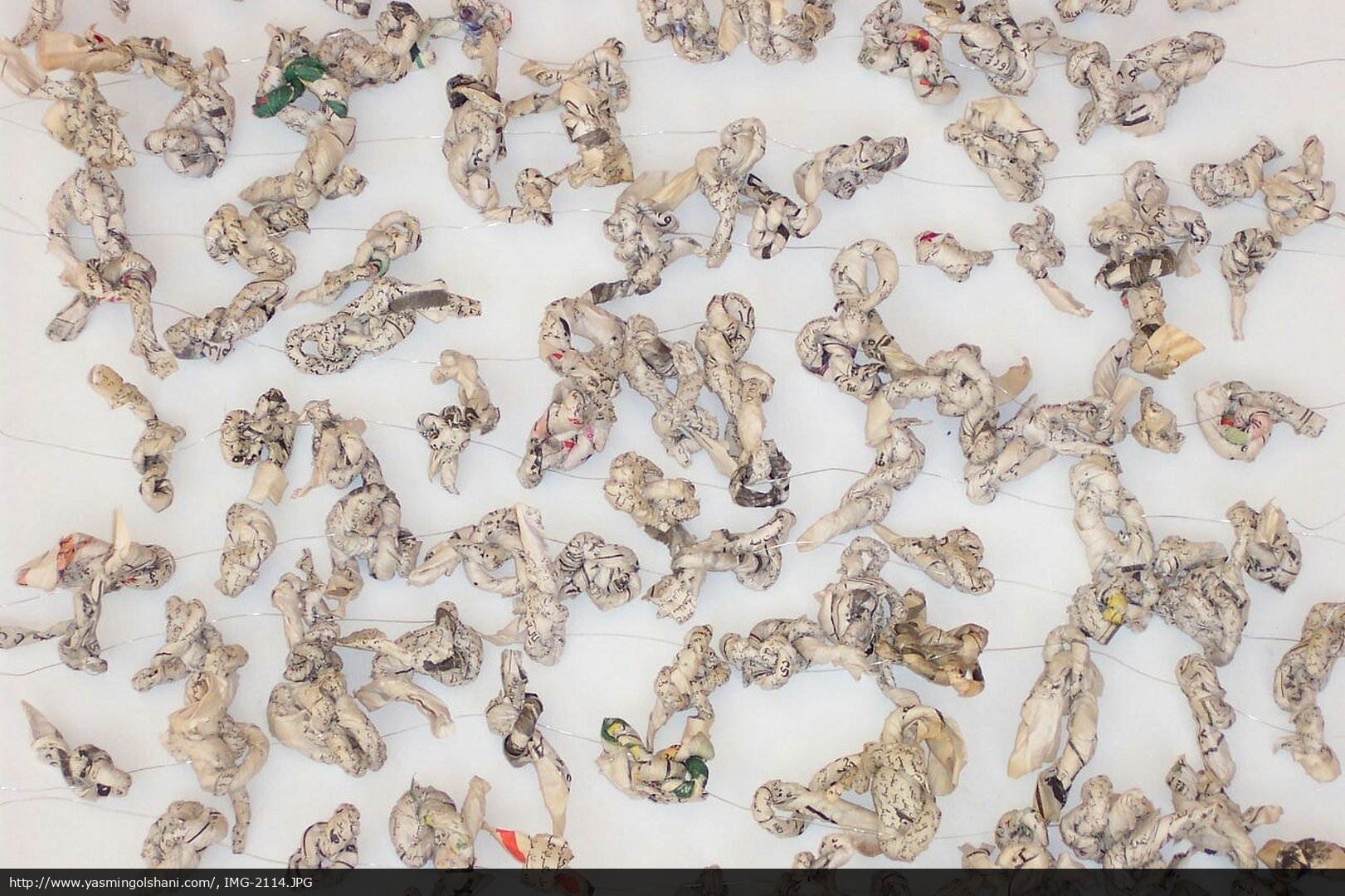 2002 - 2003. (150 x 148 cm). One Thousand and One Ties. Installation made of Iranian, French, and English newspapers sewed to a piece of cloth. The work symbolizes the complicated political issues of the Middle East. It also is a reference to an old Iranian tradition of making a tie in a sacred place when one has a wish.